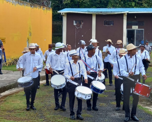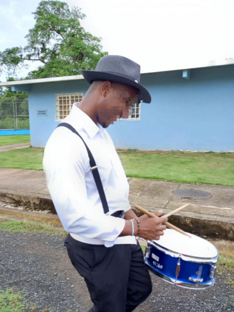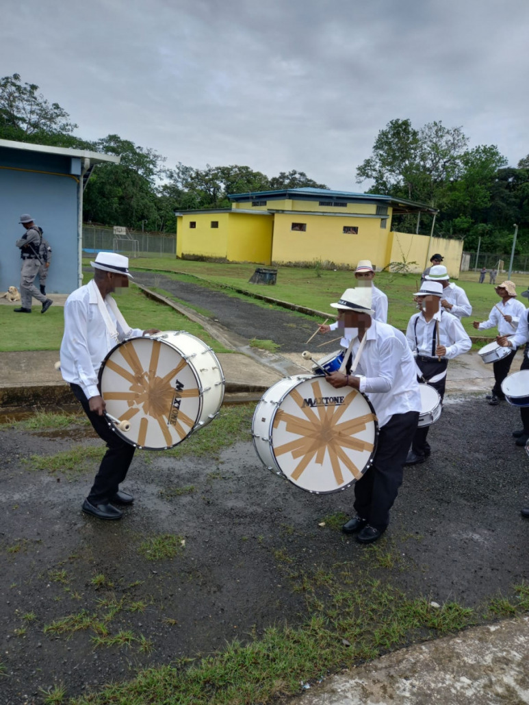 Al ritmo de bombos, redoblantes, tambores y platillos, el desfile intramuros se engalanó con la participación de los seis jóvenes de mayor índice académico quienes lucieron la emblemática cinta tricolor, siendo para el primer puesto el honor de portar el Pabellón Nacional, proseguidos por el personal del centro, docentes asignados por el Ministerio de Educación (Meduca) y el grupo de internos que demostraron talento y patriotismo liderando la banda de música.
