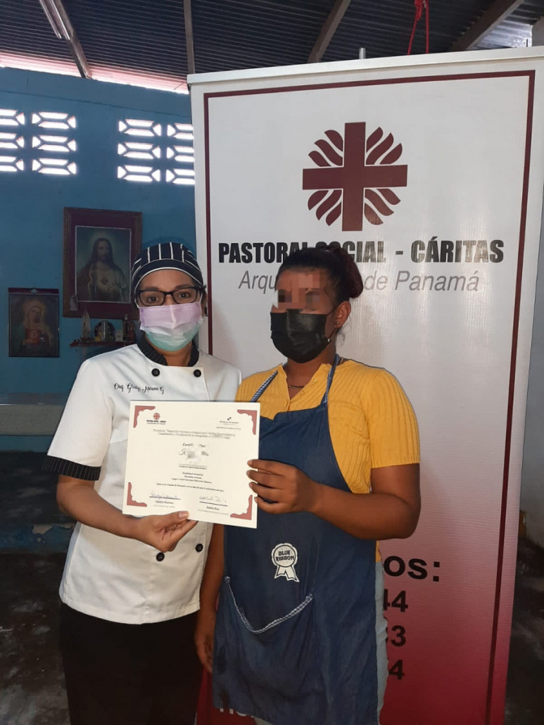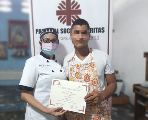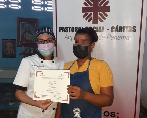 Panamá Oeste, 25 de noviembre de 2022.- Avanzando con los proyectos de emprendimiento laboral, un grupo de jóvenes con sanciones alternas a la privación de libertad y sus familiares culminaron el curso en repostería, organizado por el departamento de Sanciones y Medidas No Privativas de Libertad del Instituto de Estudios Interdisciplinarios (IEI), extensión Chorrera, en alianza con la Pastoral Social de Cáritas Arquidiocesana y el Centro San Juan Pablo II.