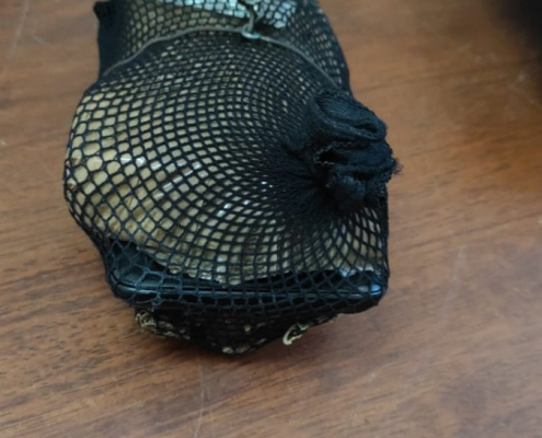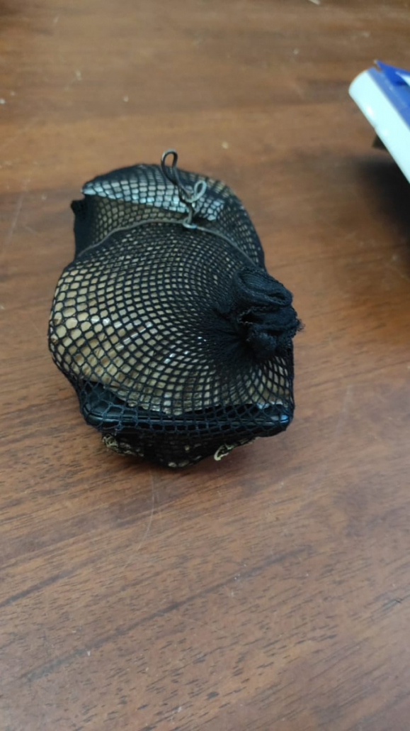 Panamá, 18 de marzo de 2022. Un envoltorio forrado con cinta adhesiva chocolate y cubierto por una maya negra que contenía en su interior presunta marihuana, cigarrillos, celulares con cargadores, audífonos y un encendedor fue lanzado por un dron en áreas de la Fase de Reintegración Social de Adultos del Centro de Cumplimiento de Las Garzas (CCLG), siendo interceptado por los custodios en horas de la noche.