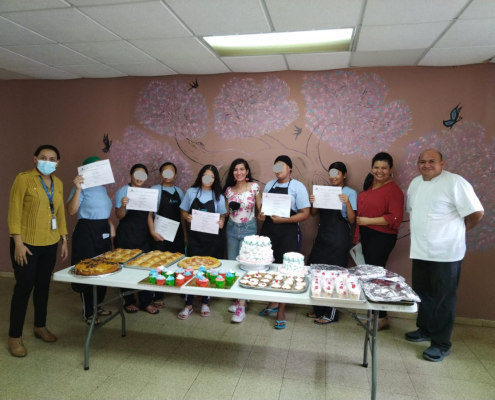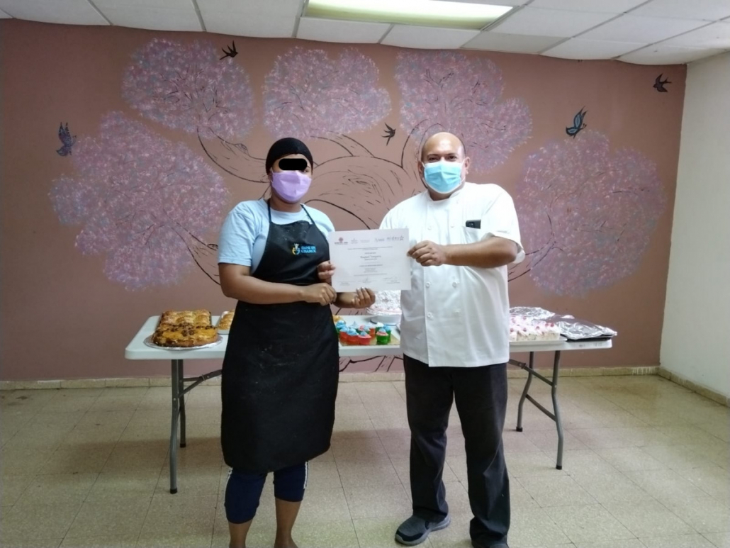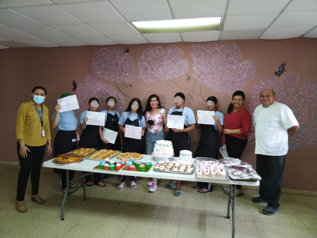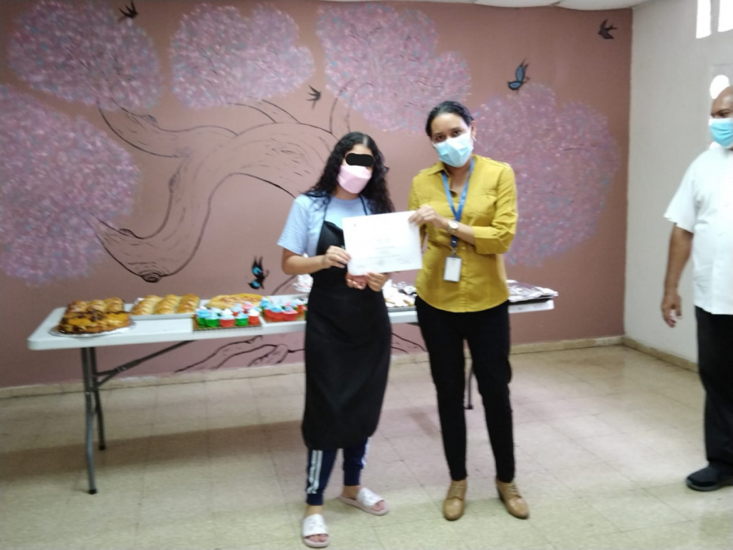 Panamá, 1 de mayo 2022. Presentando deliciosas y variadas creaciones, las jóvenes del Centro de Custodia y Cumplimiento Residencia Femenina (CCCRF) obtuvieron sus certificados de graduación del Curos de Repostería Básica que las acredita para incursionar como emprendedoras al mercado laboral una vez culminada la medida privativa de libertad.
