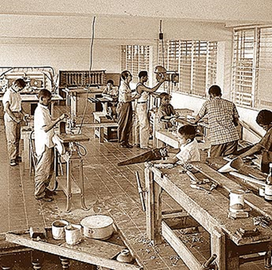 Vistas del taller de ebanistería del Tutelar de Menores, tomadas en 1958. En este taller los menores infractores se dedican a la fabricación de muebles, para luego venderlos. El Tutelar de Menores fue creado en 1951 como parte del Ministerio de Gobierno y Justicia. En 1995 se creó la Jurisdicción de Menores, que reemplazó al tribunal tutelar de menores y los centros de menores pasaron al control y administración de la Corte Suprema de Justicia. Foto EPASA