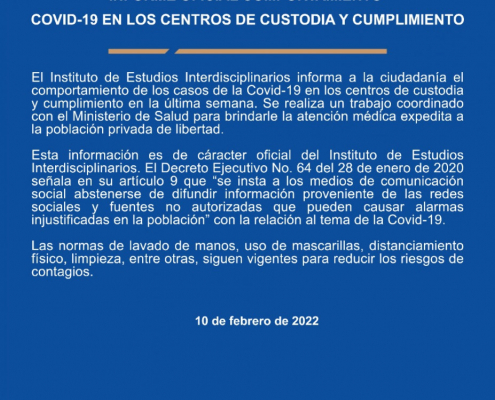Panamá, 10 de febrero 2022 – El Instituto de Estudios Interdisciplinarios informa a la ciudadanía el comportamiento de los casos de la Covid-19 en los centros de custodia y cumplimiento en la última semana. Se realiza un trabajo coordinado con el Ministerio de Salud para brindarle la atención médica expedita a la población privada de libertad.