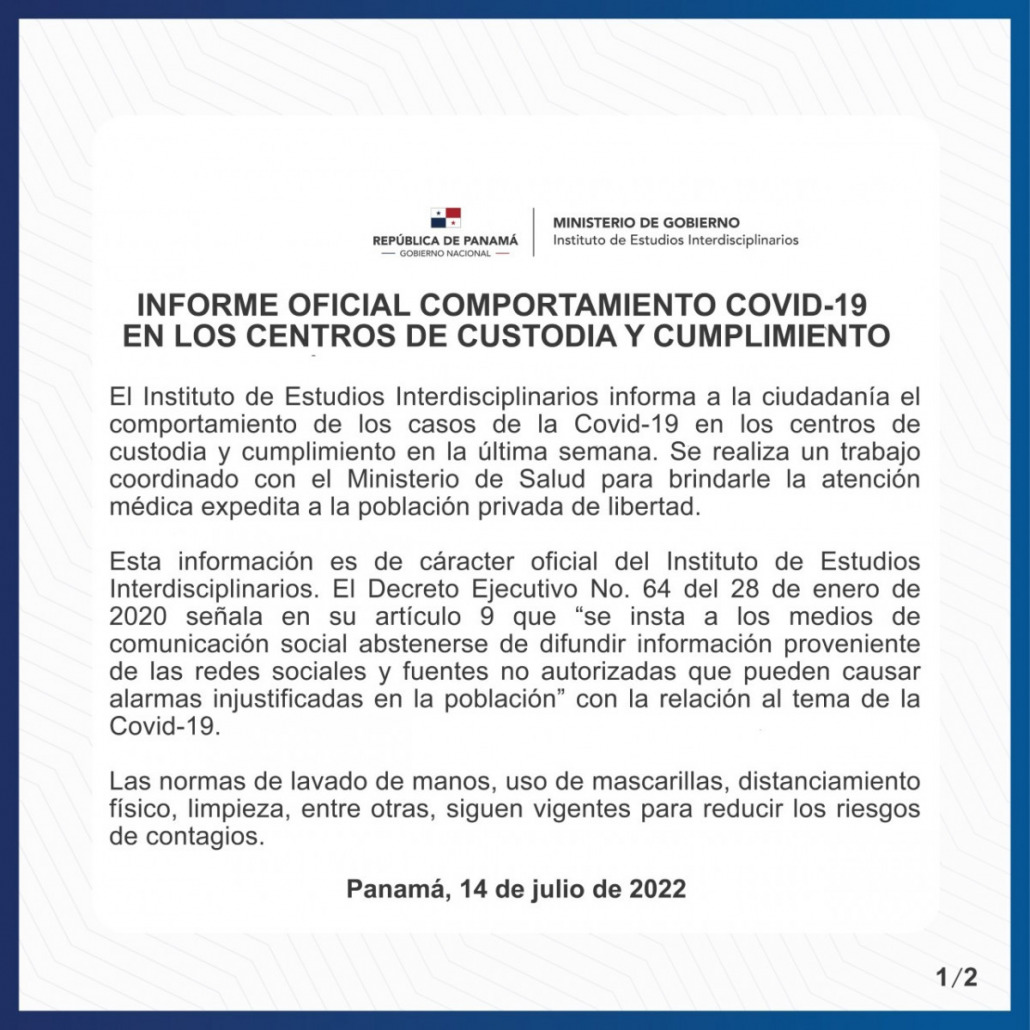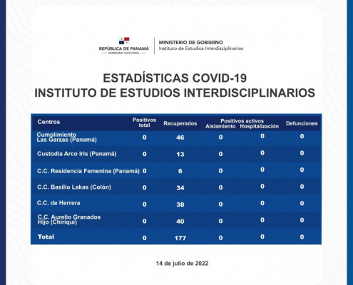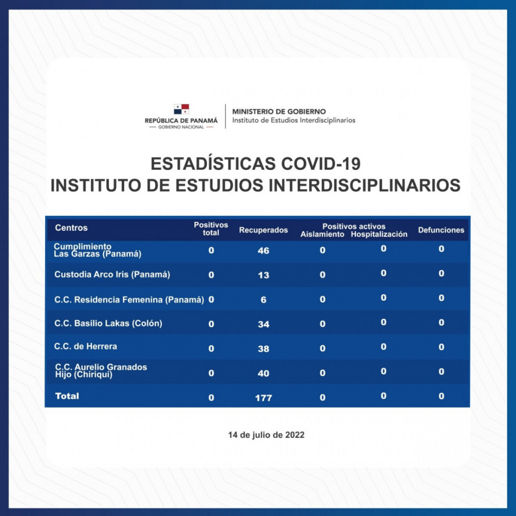 Panamá, 14 de julio 2022. El Instituto de Estudios Interdisciplinarios informa a la ciudadanía el comportamiento de los casos de la Covid-19 en los centros de custodia y cumplimiento en la última semana. Se realiza un trabajo coordinado con el Ministerio de Salud para brindarle la atención médica expedita a la población privada de libertad.