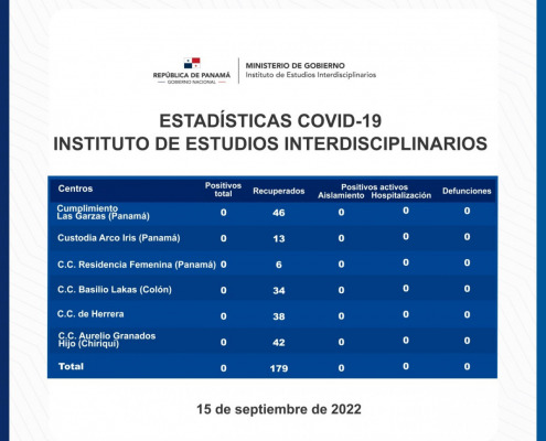 15 de septiembre 2022.- El Instituto de Estudios Interdisciplinarios informa a la ciudadanía el comportamiento de los casos de la Covid-19 en los centros de custodia y cumplimiento en la última semana. Se realiza un trabajo coordinado con el Ministerio de Salud para brindarle la atención médica expedita a la población privada de libertad.