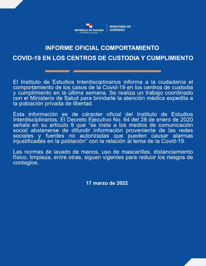 17 de marzo 2022. El Instituto de Estudios Interdisciplinarios informa a la ciudadanía el comportamiento de los casos de la Covid-19 en los centros de custodia y cumplimiento en la última semana. Se realiza un trabajo coordinado con el Ministerio de Salud para brindarle la atención médica expedita a la población privada de libertad.