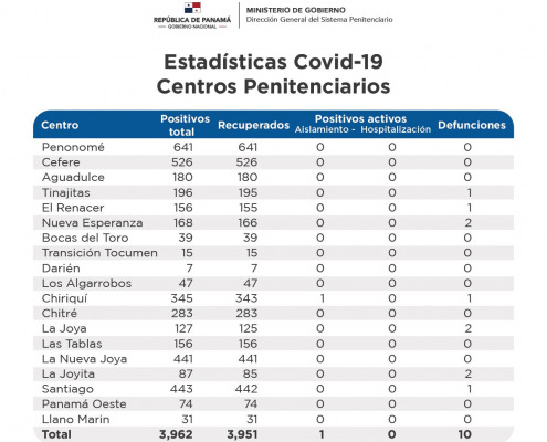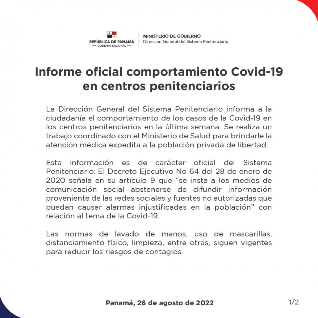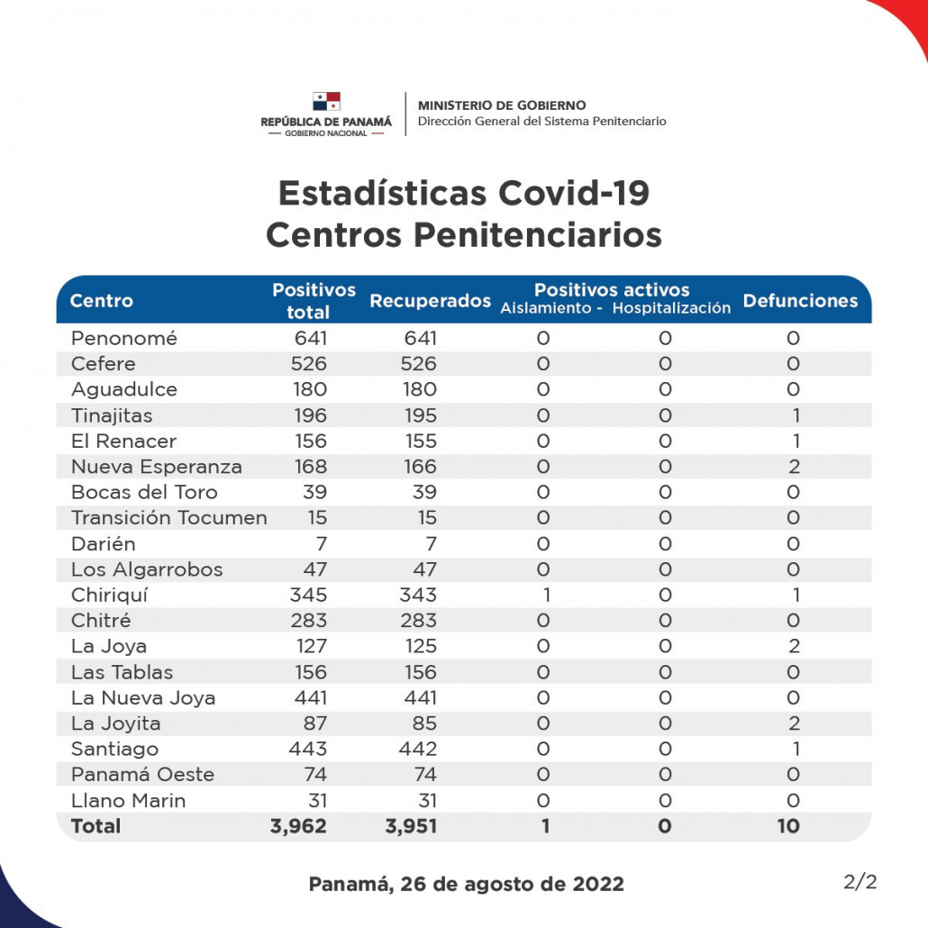 26 de agosto 2022.- El Instituto de Estudios Interdisciplinarios informa a la ciudadanía el comportamiento de los casos de la Covid-19 en los centros de custodia y cumplimiento en la última semana. Se realiza un trabajo coordinado con el Ministerio de Salud para brindarle la atención médica expedita a la población privada de libertad.