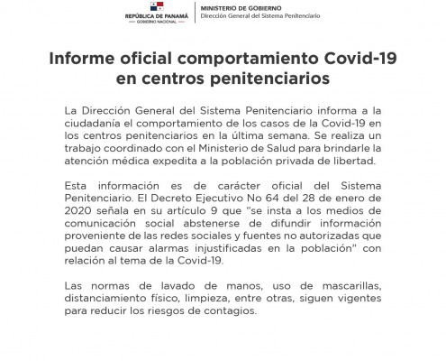 Esta información es de carácter oficial del Instituto de Estudios Interdisciplinarios. El Decreto Ejecutivo N° 64 del 28 de enero de 2020 señala en su Artículo N° 9 que “se insta a los medios de comunicación social abstenerse de difundir información proveniente de las redes sociales y fuentes no autorizadas que puedan causar alarmas injustificadas en la población” con relación al tema de la Covid-19.