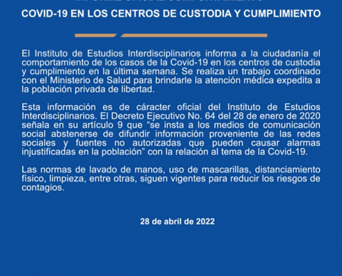 Panamá, 28 de abril 2022. El Instituto de Estudios Interdisciplinarios informa a la ciudadanía el comportamiento de los casos de la Covid-19 en los centros de custodia y cumplimiento en la última semana. Se realiza un trabajo coordinado con el Ministerio de Salud para brindarle la atención médica expedita a la población privada de libertad.