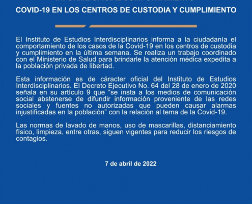 Panamá, 7 de abril 2022. El Instituto de Estudios Interdisciplinarios informa a la ciudadanía el comportamiento de los casos de la Covid-19 en los centros de custodia y cumplimiento en la última semana. Se realiza un trabajo coordinado con el Ministerio de Salud para brindarle la atención médica expedita a la población privada de libertad.