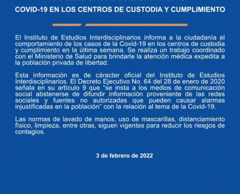 Panamá 3 de febrero 2022 El Instituto de Estudios Interdisciplinarios informa a la ciudadanía el comportamiento de los casos de la Covid-19 en los centros de custodia y cumplimiento en la última semana. Se realiza un trabajo coordinado con el Ministerio de Salud para brindarle la atención médica expedita a la población privada de libertad.