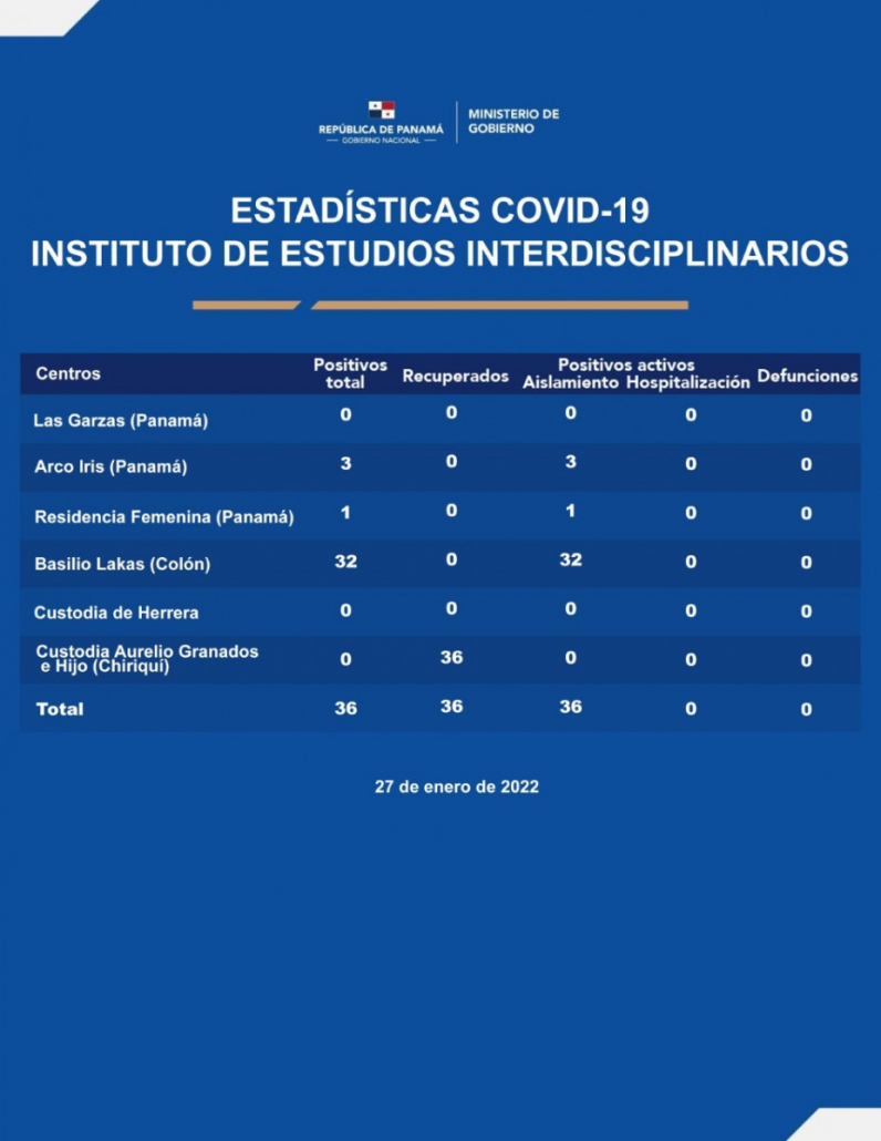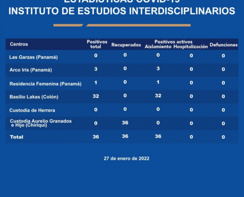 Panamá 27 de enero 2022. El Instituto de Estudios Interdisciplinarios informa a la ciudadanía el comportamiento de los casos de la Covid-19 en los centros de custodia y cumplimiento en la última semana. Se realiza un trabajo coordinado con el Ministerio de Salud para brindarle la atención médica expedita a la población privada de libertad.