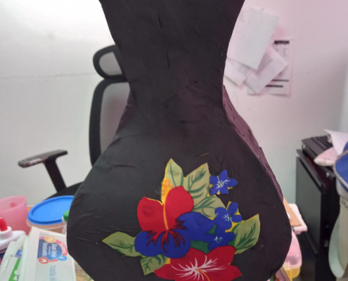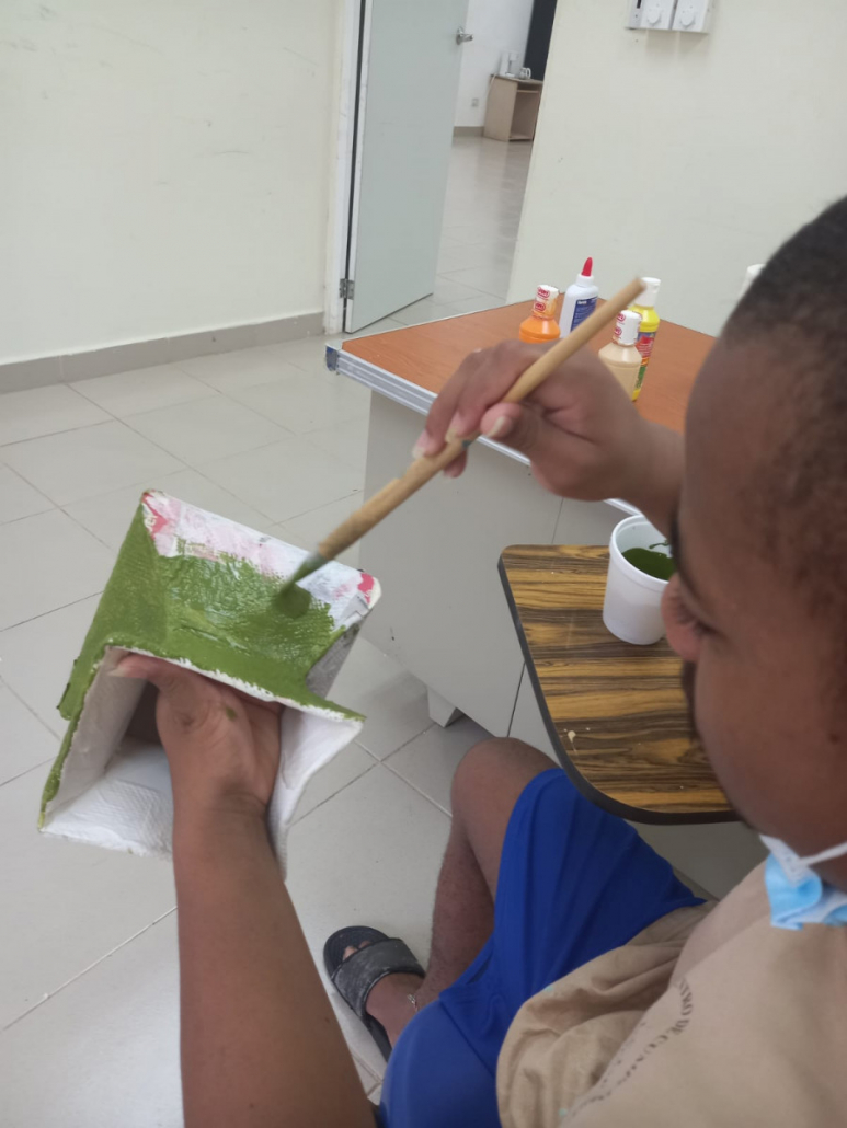 Periódicos, papel manila, cartones, pinturas acrílicas y goma son algunos de los materiales que están utilizando los participantes para elaborar creativas y coloridas artesanías destinadas a la exposición de arte que se realizará para la conmemoración del aniversario del Balilio Lakas.