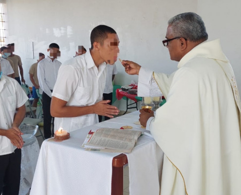 De la mano del reverendo Padre Rafael Siu, director espiritual de la Comunidad Misionera de Jóvenes MENAHEM, los privados de libertad lograron hacer realidad el objetivo manifestado de confirmar su fe. “Los adolescentes nos habían expresado su gran deseo de recibir las aguas bautismales y comulgar dentro del centro por ser el lugar donde conocieron el credo católico y el papel protagónico de María en la historia de la salvación, estaban felices”, indicó Luis Hernández asesor del Centro San Juan Pablo II.