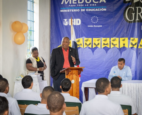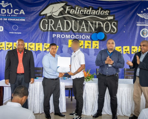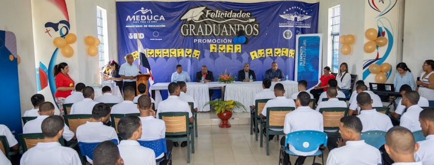 Resultado del convenio entre el Misterio de Gobierno (MINGOB) y el INADEH para la formación de los privados de libertad de los centros de custodia y cumplimiento del IEI, se efectúo el evento donde formalizaron la entrega de los respectivos diplomas a los jóvenes que cumplieron con éxito el pensum académico de los talleres de Barbero, Barba y Bigote, Ebanistería Básica, Albañilería Básica, Confección de Adornos Navideños, Manejo de Emociones y Desarrollo Humano.