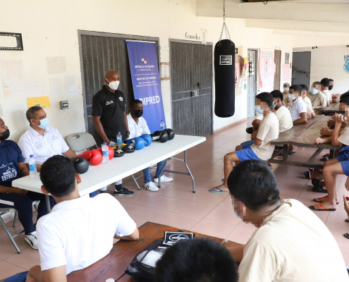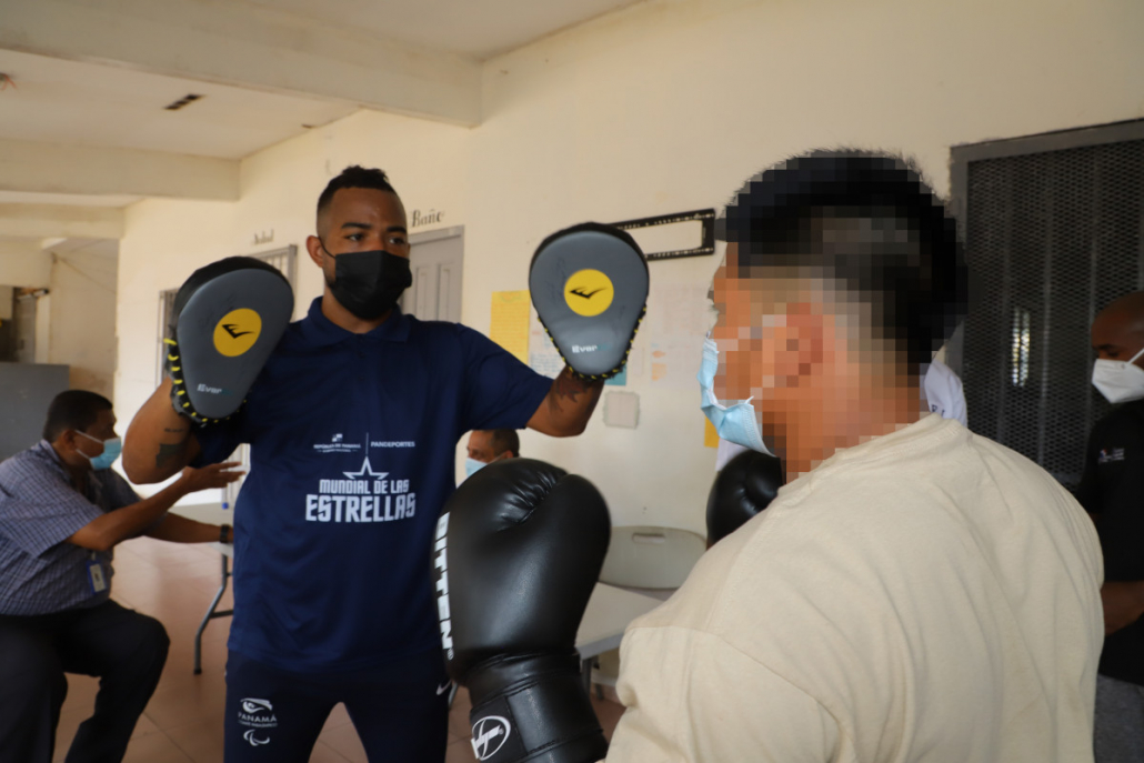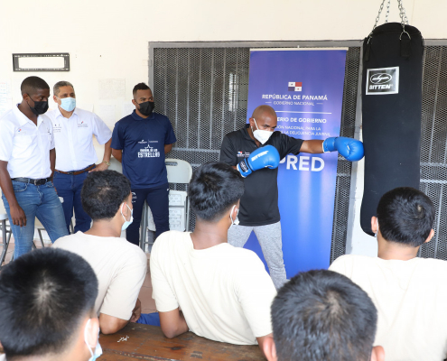 Chiriquí, 22 de febrero de 2022. Con los guantes puestos y haciendo gala de su destreza al lanzar un “jab” seguido de un “gancho”, una de las glorias del boxeo panameño Roberto “La Araña” Vásquez se tomó el Centro de Custodia y Cumplimiento Aurelio Granados Hijo de la provincia de Chiriquí ante la mirada atónita y cargada de admiración por parte de los jóvenes en conflicto con la Ley Penal.