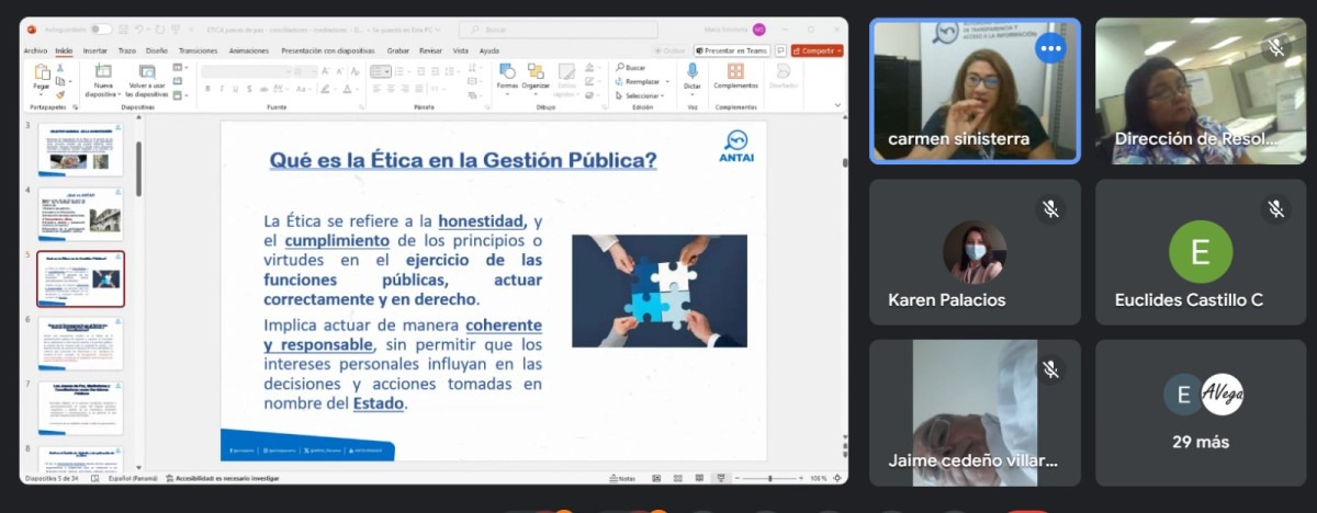 Panamá, 19 de agosto de 2024. El rol de los jueces de paz y mediadores comunitarios, así como la ética en su gestión es abordada en una jornada de capacitación organizada por la Dirección de Resolución Alterna de Conflictos (DRAC), y dictada por María del Carmen Sinisterra, abogada de la Autoridad Nacional de Transparencia y Acceso a la Información (ANTAI).