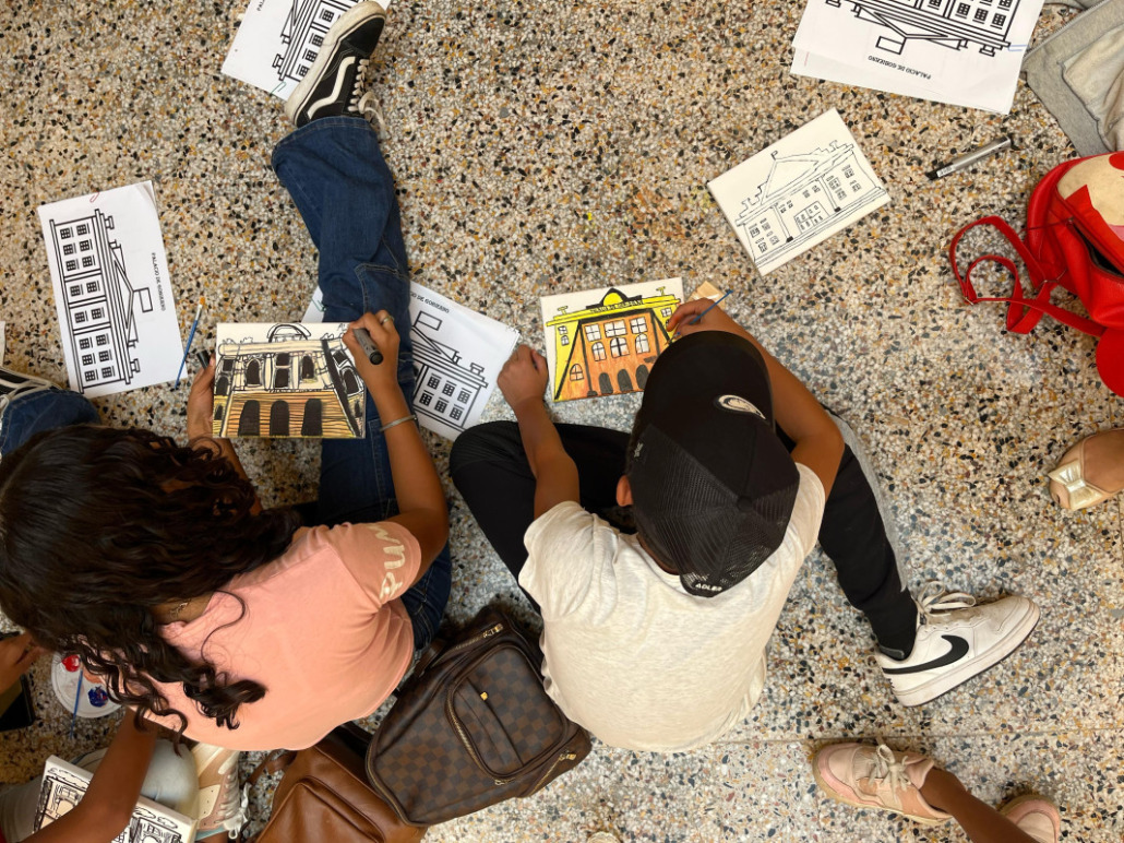 En esta ocasión, los niños jugaron y aplicaron todas sus técnicas sobre dibujo y pintura, resaltando la estructura del monumental edificio del Palacio de Gobierno.