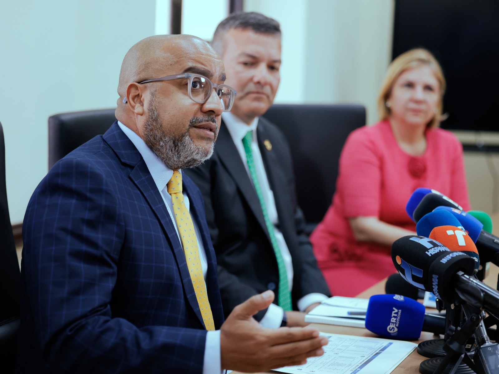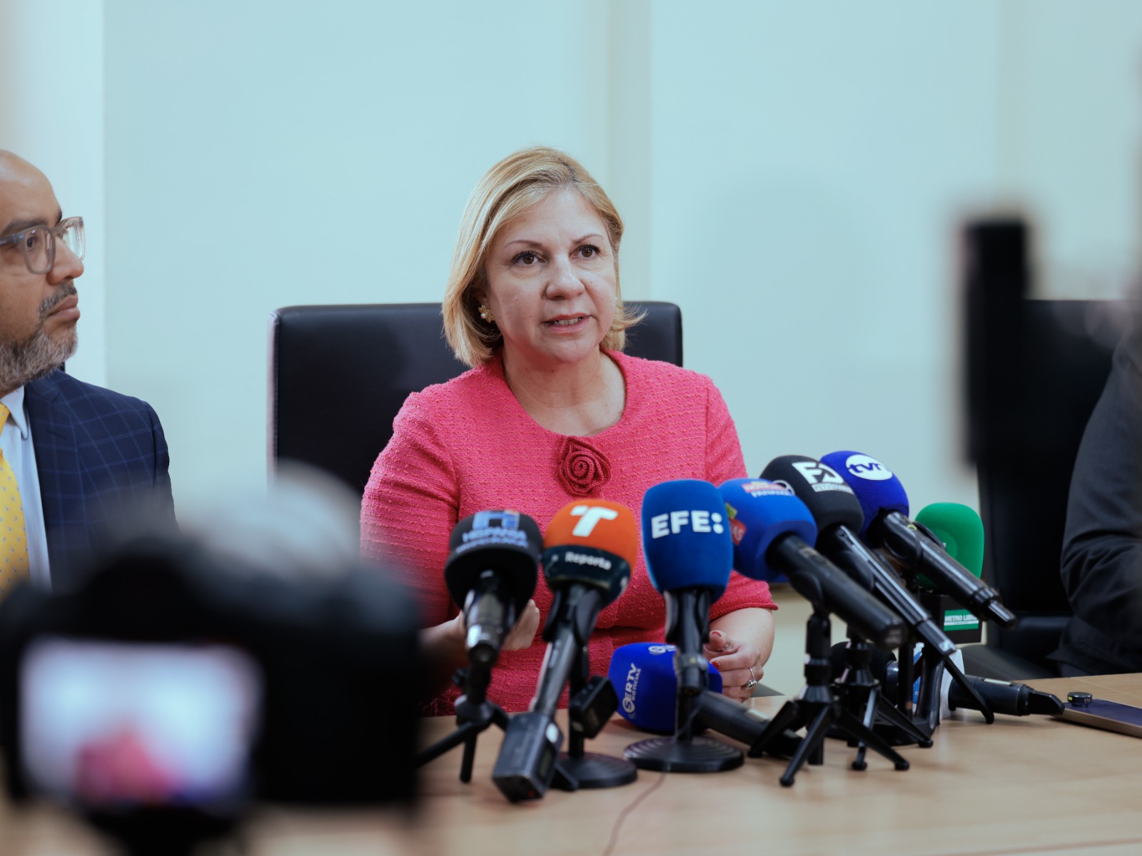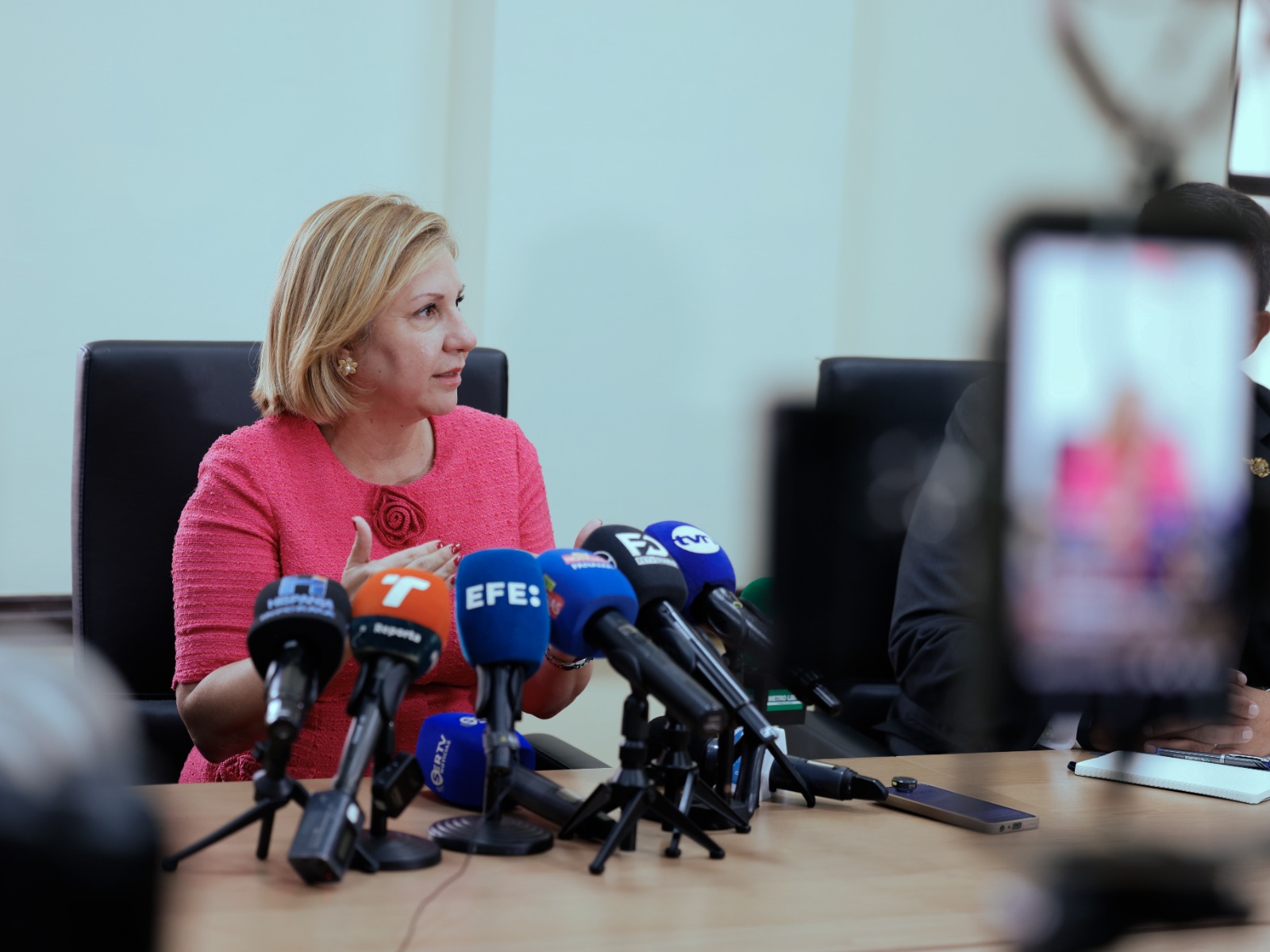 Panamá 27 de abril de 2026.- La ministra de Gobierno, Dinoska Montalvo, ofreció una conferencia de prensa acompañada por el director de la Policía Nacional, Jaime Fernández y el director general del Sistema Penitenciario, Jorge Torregroza, en la que abordó temas relacionados con la seguridad del sistema penitenciario, los hechos ocurridos en La Joya y la rebaja de pena.