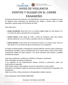 Panamá, 03 de febrero de 2025.- El Sistema Nacional de Protección Civil (SINAPROC) comunica que se mantiene un aviso de vigilancia...