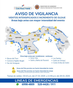 Panamá, 27 de enero de 2025.- El Sistema Nacional de Protección Civil (Sinaproc) comunica que se mantiene un aviso de vigilancia por...