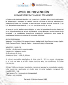 Panamá, 19 de octubre de 2025.- El Sistema Nacional de Protección Civil (SINAPROC), en base a pronósticos del Instituto de...