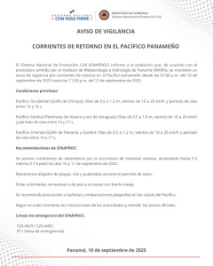 Panamá, 10 de septiembre de 2025.- El Sistema Nacional de Protección Civil (SINAPROC) informa a la población que, de acuerdo...