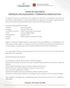 Panamá, 29 de julio de 2025.- El Sistema Nacional de Protección Civil (Sinaproc) informa a la ciudadanía que ante los pronósticos...