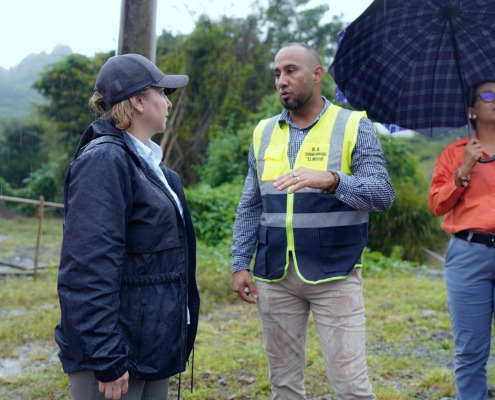 La ministra Dinoska Montalvo junto a la coordinadora de enlace del Gabinete de Gestión Integral de Riesgos de Desastres del Mingob, Blanca Gómez, llevaron el mensaje del Gobierno Nacional de redoblar esfuerzos para garantizar una gestión eficiente del riesgo y la protección efectiva de nuestras comunidades.
