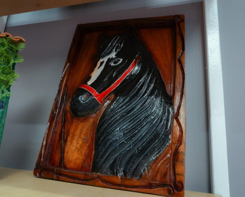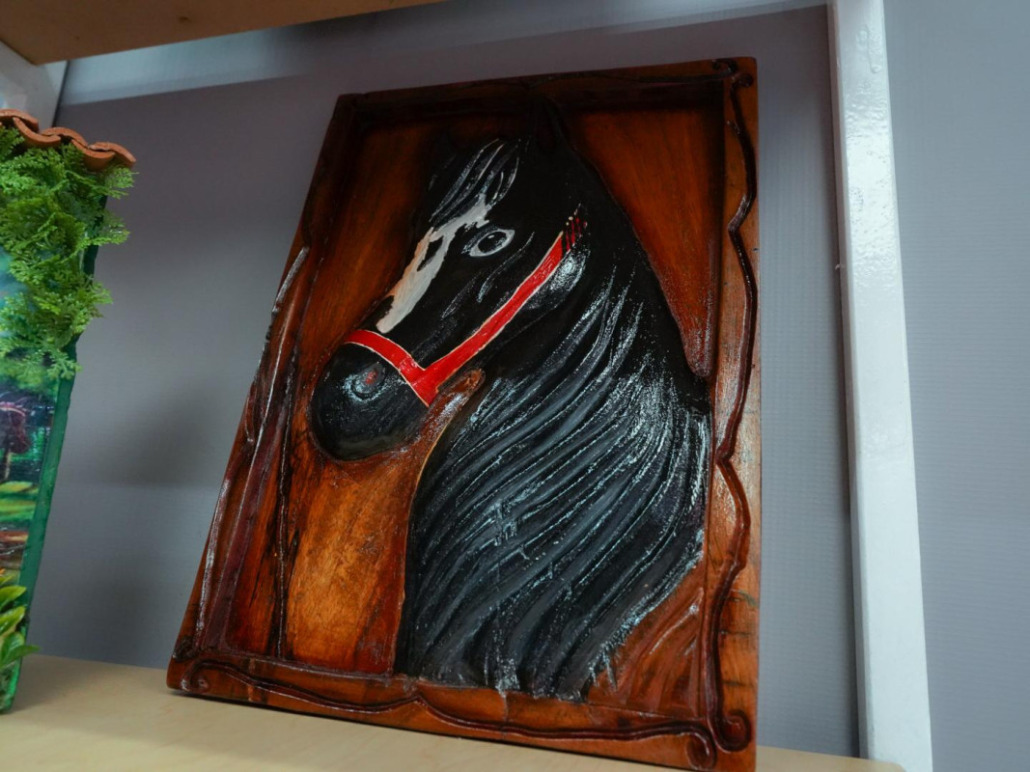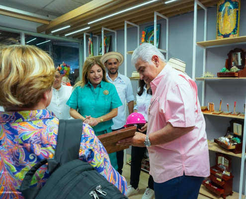 Durante el recorrido por el stand, se le obsequió al Presidente un cuadro tallado en madera, confeccionado por privados de libertad del Centro Penitenciario de Penonomé. El cuadro muestra la imponente figura de un caballo negro.