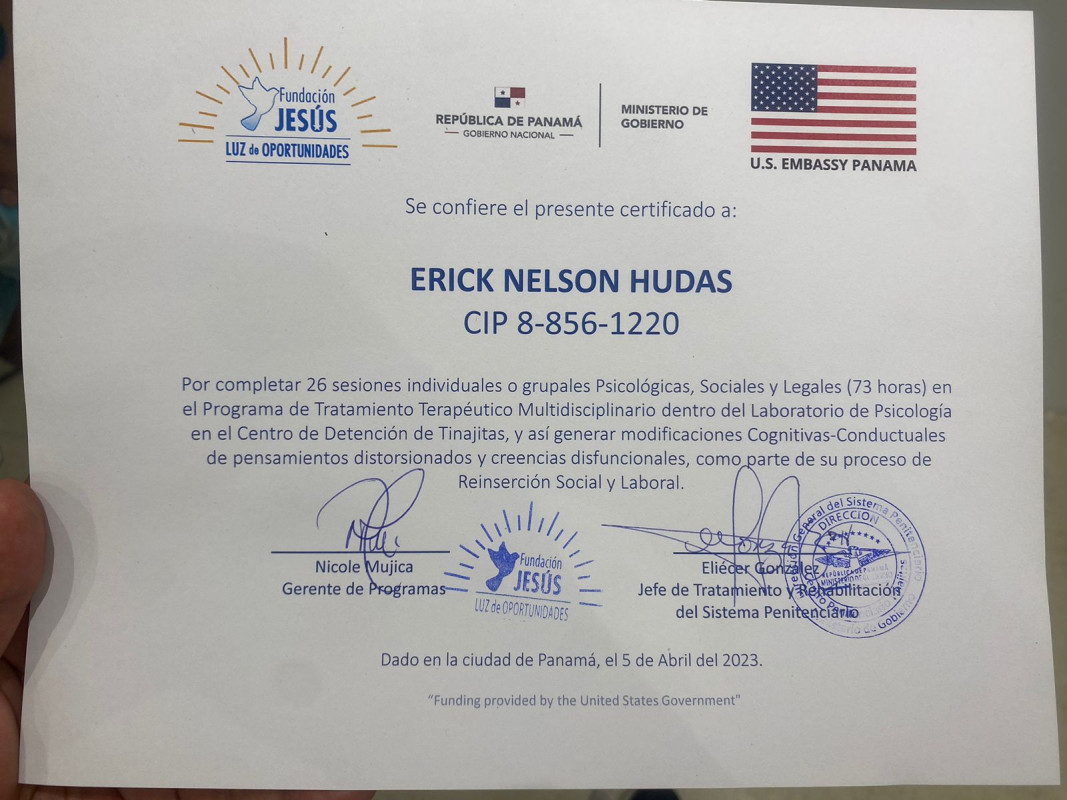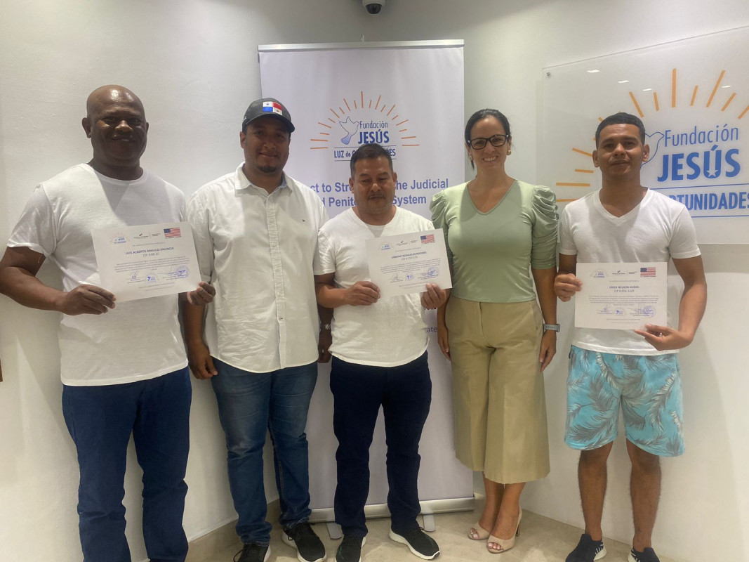 Panamá, 14 de abril de 2023. Tres privados de libertad del centro de Detención de Tinajitas fueron los primeros beneficiados en culminar el Programa de Tratamiento Terapéutico Multidisciplinario del laboratorio de psicología, actividad a cargo de la Fundación Jesús Luz de Oportunidades (FJLOP) en coordinación con el Departamento de Tratamiento y Rehabilitación de la Dirección General del Sistema Penitenciario (DGSP).