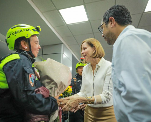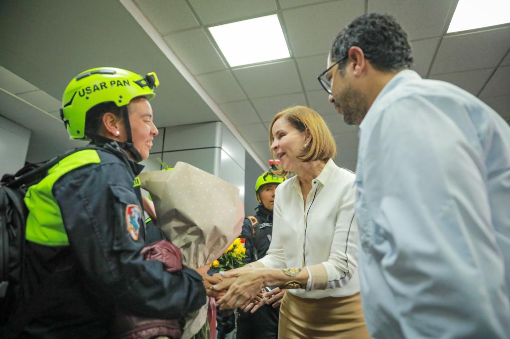Le correspondía a la primera Dama de Panamá, Yazmin de Cortizo y al ministro de Gobierno, Roger Tejada, recibir en la terminal área a los rescatistas.