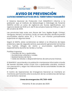 Noticias 2024 Noticias 2023 Noticias 2022 Sala de PrensaMingob presente en el desfile de las mil naguas16 octubre, 2025Noticias 2025Leer másAviso de prevención Lluvias significativas en el territorio panameño15 octubre, 2025Noticias 2025Leer másPlan Libertad se expande para brindar mantenimiento y limpieza a instalaciones de la CSS15 octubre, 2025Noticias 2025Leer másSINAPROC reporta más de 390 mil personas evacuadas durante el segundo Simulacro Nacional de Evacuación 202514 octubre, 2025Noticias 2025Leer másEl Mingob avanza con la firma de acta de toma de posesión y la inducción a los nuevos servidores públicos de justicia comunitaria14 octubre, 2025Noticias 2025Leer másMingob continúa con traspaso de despacho de los Juzgados Comunitarios14 octubre, 2025Noticias 2025Leer másAmarilis Cáceres Andrades es designada nueva gobernadora de la Comarca Ngäbe-Buglé13 octubre, 2025Noticias 2025Leer másJornada de limpieza en predios de Los Algarrobos con apoyo del Municipio de Dolega13 octubre, 2025Noticias 2025Leer másSinaproc da a conocer reportes de las personas evacuadas durante Simulacro13 octubre, 2025Noticias 2025Leer más«‹2345678910›»