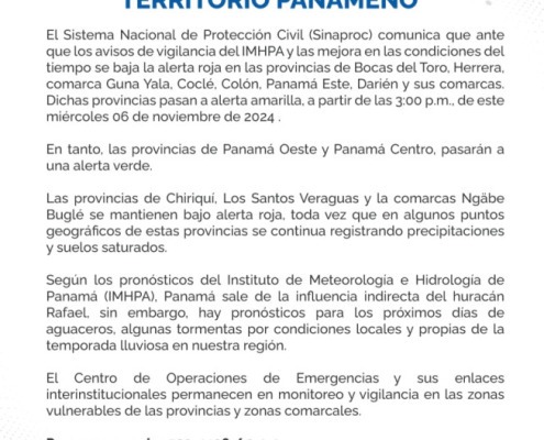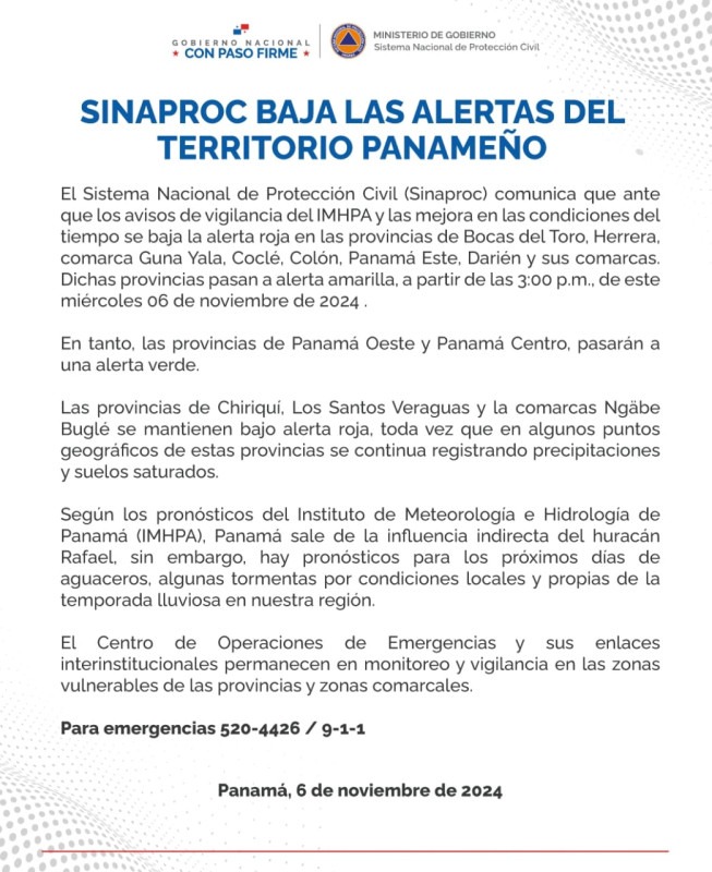 El Sistema Nacional de Protección Civil (Sinaproc) comunica que ante que los avisos de vigilancia del IMHPA y las mejora en las condiciones del tiempo se baja la alerta roja en las provincias de Bocas del Toro, Herrera, comarca Guna Yala, Coclé, Colón, Panamá Este, Darién y sus comarcas. Dichas provincias pasan a alerta amarilla, a partir de las 3:00 p.m., de este miércoles 06 de noviembre de 2024 .