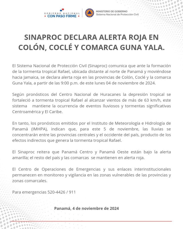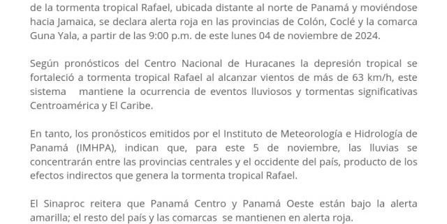 Panamá, 4 de noviembre del 2024. El Sistema Nacional de Protección Civil (Sinaproc) comunica que ante la formación de la tormenta tropical Rafael, ubicada distante al norte de Panamá y moviéndose hacia Jamaica, se declara alerta roja en las provincias de Colón, Coclé y la comarca Guna Yala, a partir de las 9:00 p.m. de este lunes 04 de noviembre de 2024.