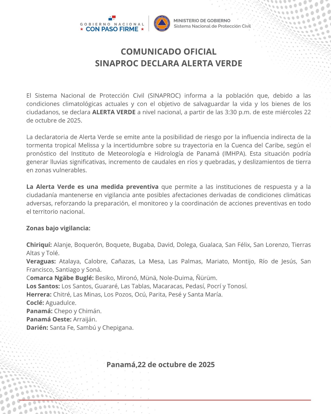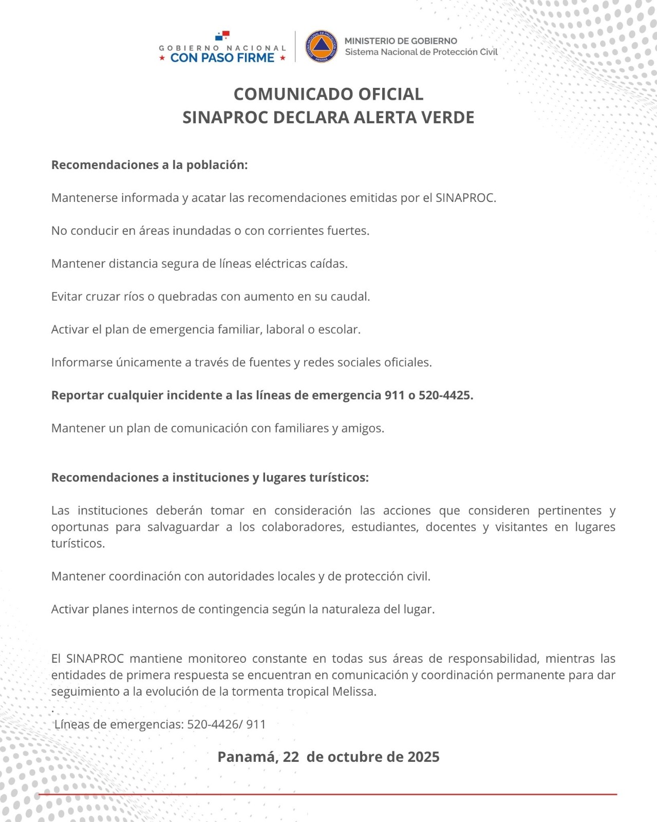 Panamá, 22 de octubre de 2025.- El Sistema Nacional de Protección Civil (SINAPROC) informa a la población que, debido a las condiciones climatológicas actuales y con el objetivo de salvaguardar la vida y los bienes de los ciudadanos, se declara ALERTA VERDE a nivel nacional, a partir de las 3:30 p.m. de este miércoles 22 de octubre de 2025.