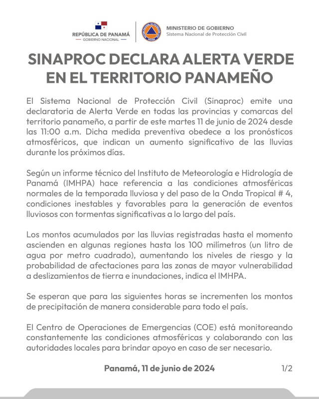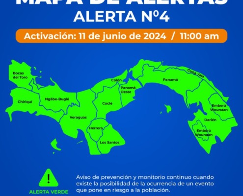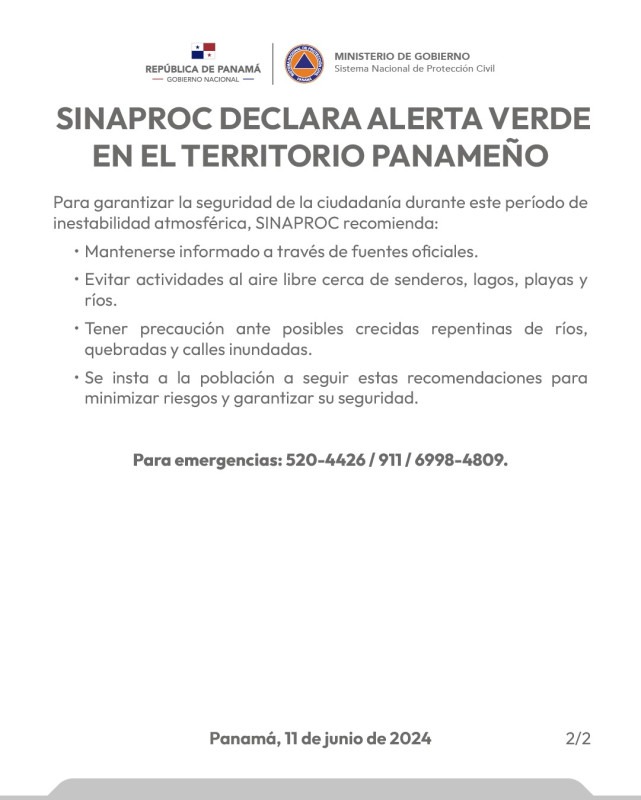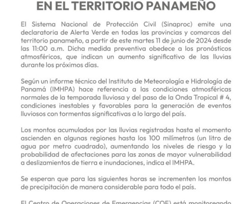 Panamá, 11 de junio de 2024. El Sistema Nacional de Protección Civil (Sinaproc) emite una declaratoria de Alerta Verde en todas las provincias y comarcas del territorio panameño, a partir de este martes 11 de junio de 2024 desde las 11:00 a.m. Dicha medida preventiva obedece a los pronósticos atmosféricos, que indican un aumento significativo de las lluvias durante los próximos días.