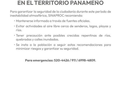 Para garantizar la seguridad de la ciudadanía durante este período de inestabilidad climática, SINAPROC recomienda: