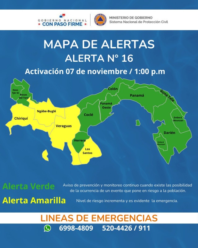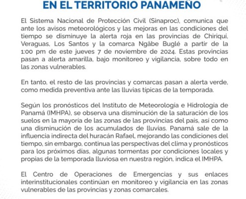 Panamá 7 de noviembre de 2024. El Sistema Nacional de Protección Civil (Sinaproc), comunica que ante los avisos meteorológicos y las mejoras en las condiciones del tiempo se disminuye la alerta roja en las provincias de Chiriquí, Veraguas, Los Santos y la comarca Ngäbe Buglé a partir de las 1:00 pm de este jueves 7 de noviembre de 2024. Estas provincias pasan a alerta amarilla, bajo monitoreo y vigilancia, sobre todo en las zonas vulnerables.