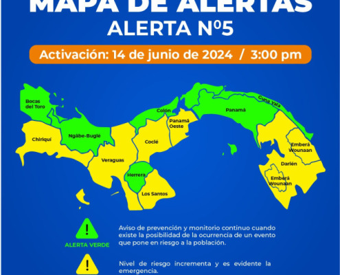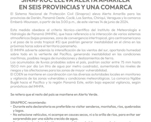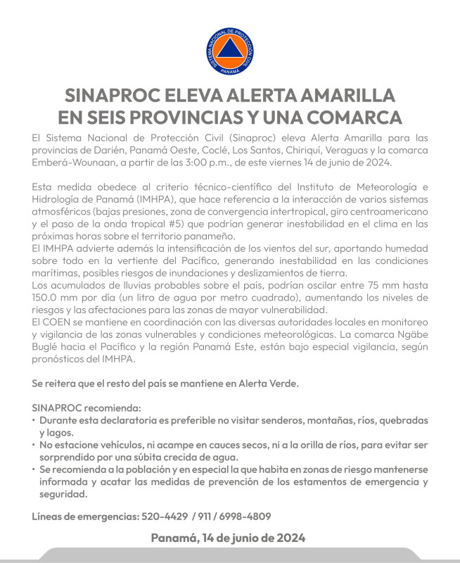 Panamá, 14 de junio de 2024. El Sistema Nacional de Protección Civil (Sinaproc) eleva Alerta Amarilla para las provincias de Darién, Panamá Oeste, Coclé, Los Santos, Chiriquí, Veraguas y la comarca Emberá-Wounaan, a partir de las 3:00 p.m., de este viernes 14 de junio de 2024.