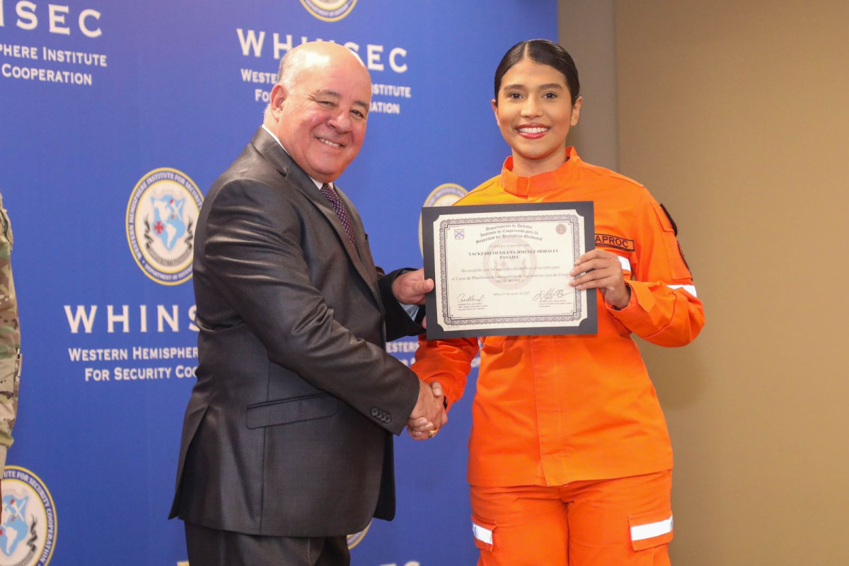 Panamá, 26 de agosto de 2025.- El Sistema Nacional de Protección Civil (SINAPROC) se enorgullece en anunciar que la jefa de operaciones de la provincia de Veraguas, Yackzabeth Jiménez, culminó con éxito el curso de Planeamiento, Manejo y Respuesta de Crisis y Alivio Humanitario, impartido en el Instituto de Cooperación para el Hemisferio Occidental (WHINSEC, por sus siglas en inglés), en Estados Unidos.