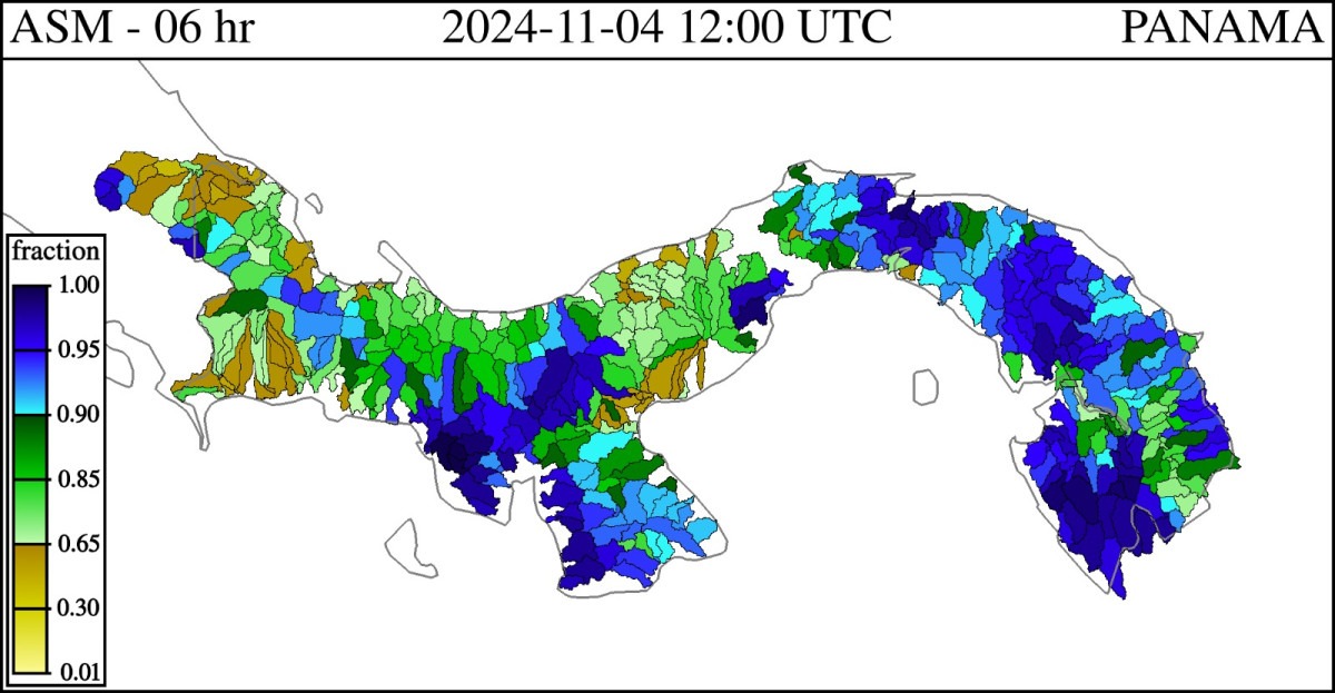 Según el Sistema de Guías de Crecidas Repentinas de América Central, para Panamá: se muestra en tonalidades color azul a la región oriental (desde Panamá Este y Costa Arriba de Colón hasta Darién y comarcas Emberá), junto con el sector de Azuero y la provincia de Veraguas, una elevada cantidad de agua retenida en los suelos (saturación), aumentando el nivel de riesgo a deslizamientos e inundaciones en los sectores citados. (Ver imagen).