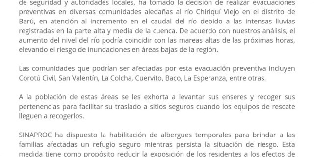 El Sistema Nacional de Protección Civil (SINAPROC), en coordinación con la gobernación de la provincia de Chiriquí, los estamentos de seguridad y autoridades locales, ha tomado la decisión de realizar evacuaciones preventivas en diversas comunidades aledañas al río Chiriquí Viejo en el distrito de Barú, en atención al incremento en el caudal del río debido a las intensas lluvias registradas en la parte alta y media de la cuenca. De acuerdo con nuestros análisis, el aumento del nivel del río podría coincidir con las mareas altas de las próximas horas, elevando el riesgo de inundaciones en áreas bajas de la región.