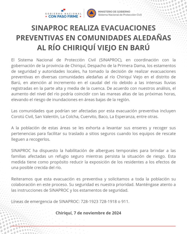 Reiteramos que esta evacuación es preventiva y solicitamos a toda la población su colaboración en este proceso. Su seguridad es nuestra prioridad. Manténgase atento a las instrucciones de SINAPROC y los estamentos de seguridad.